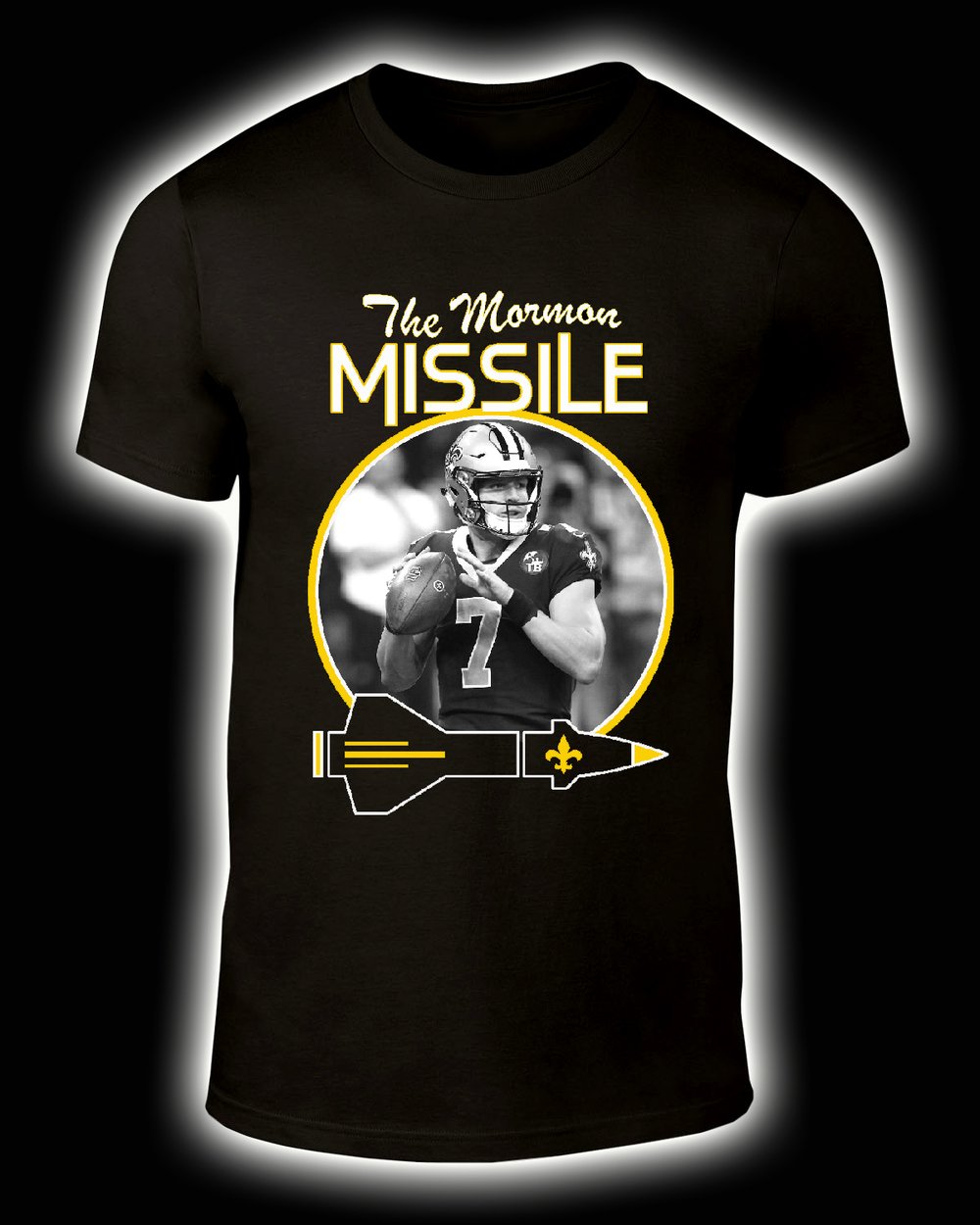 Rich gold, white and grey ink on black tee